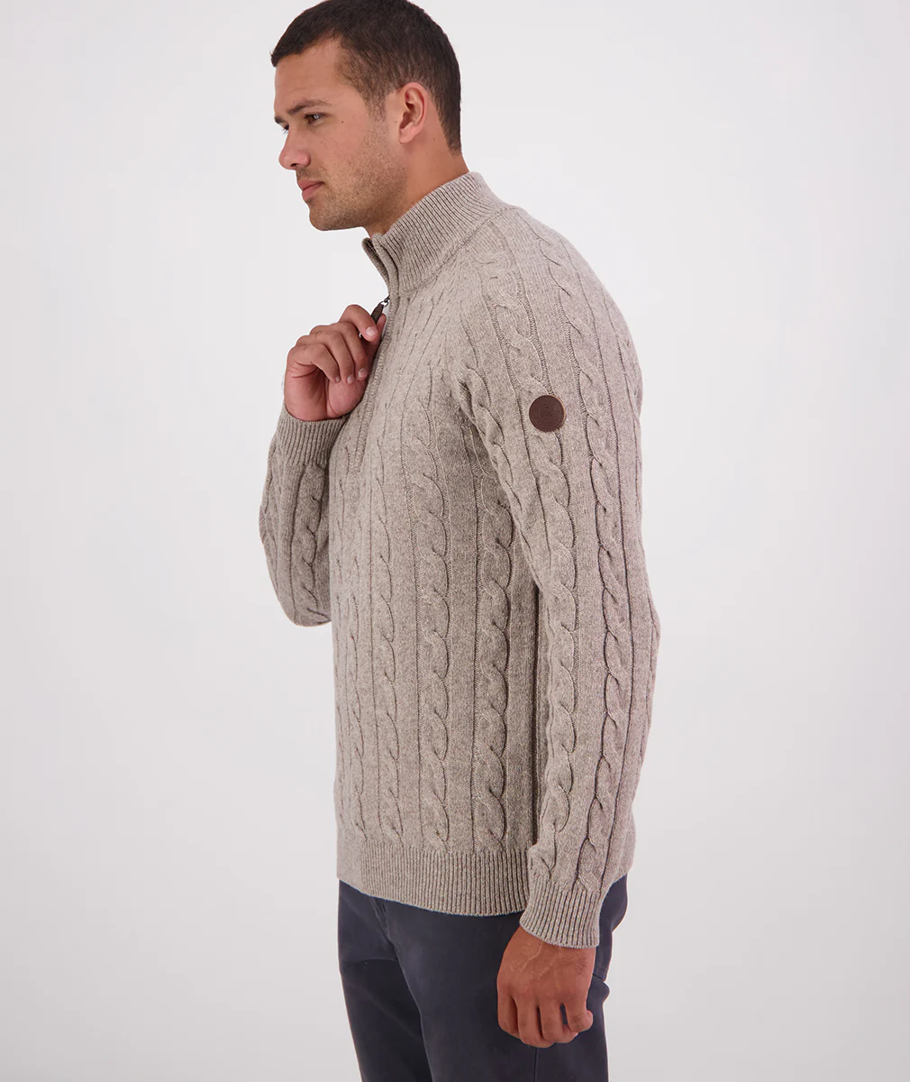 Made with 65% wool with the added strength of nylon, our Doncaster knit features a quarter zip, and cable-knit design.